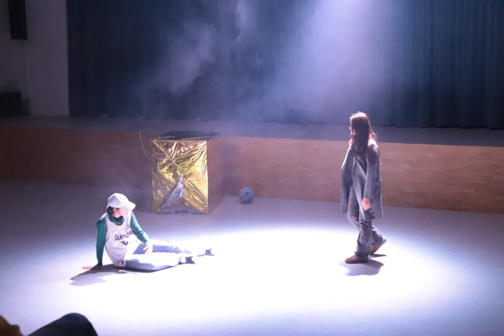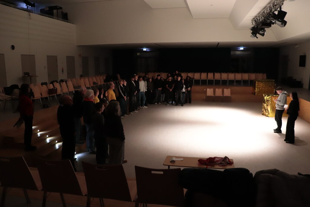 Ganz am Ende dieser Aufführung gab der Kurs dem Publikum einen Denkanstoß und bar alle, sich auch auf der Bühne zu versammeln. Dem Publikum wurden Fragen gestellt. Mit der eigenen Position auf der Bühne antwortete man. Die Frage, die mir im Kopf geblieben ist, lautet: Warum behandeln Männer Frauen so? Sind es die gesellschaftlichen Strukturen verantwortlich oder wollen die Männer Macht über die Frauen haben? Das Publikum konnte sich auch dazu äußern, warum es sich da hinstellte.